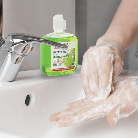 Жидкое мыло ОФИСМАГ "Зеленое яблоко" идеально подходит для использования в офисах, отелях, ресторанах и других общественных местах.