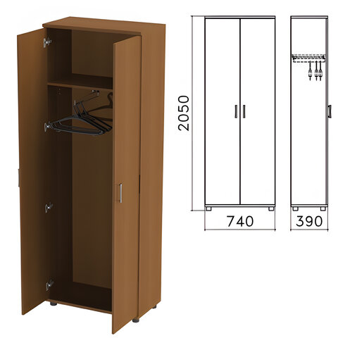Шкаф для одежды глубиной - 390 мм (с учетом фасадов) оборудован выдвижной штангой для плечиков и отделением для головных уборов. Регулируемые опоры позволяют компенсировать возможные неровности пола.