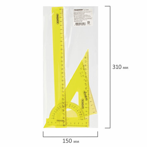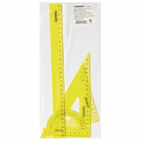 Набор чертежный большой ПИФАГОР (линейка 30 см, 2 треугольника, транспортир), прозрачный, неоновый, пакет, 210629
