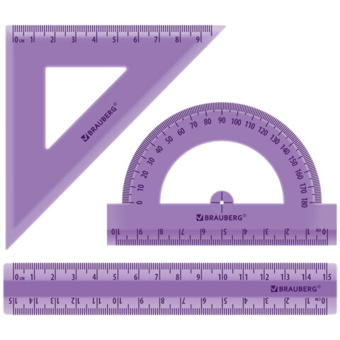 Набор чертежный BRAUBERG (линейка 15 см, треугольник, транспортир), фиолетовый, прозрачный, пенал, 210888