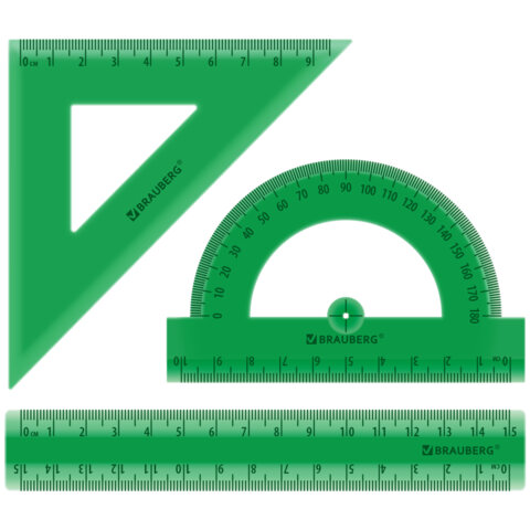 Набор чертежный BRAUBERG (линейка 15 см, треугольник, транспортир), зеленый, прозрачный, пенал, 210890
