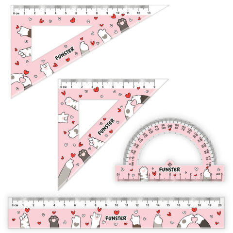 Набор чертежный FUNSTER (линейка 20 см, 2 треугольник, транспортир), "КОТЫ", пенал, 210912