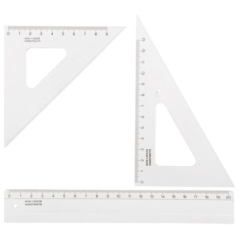В малый чертежный набор KOH-I-NOOR входят: линейка со шкалой 20 см; угольник с углами 30/60/90° и шкалой 13 см; угольник с углами 45/45/90° и шкалой 9 см; транспортир 180/100°. Геометрический набор KOH-I-NOOR включает все, что необходимо школьнику.