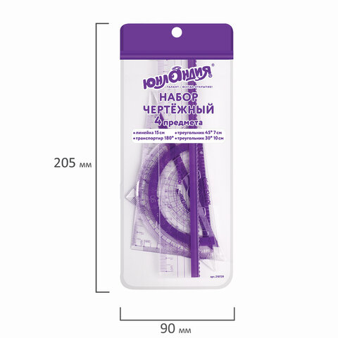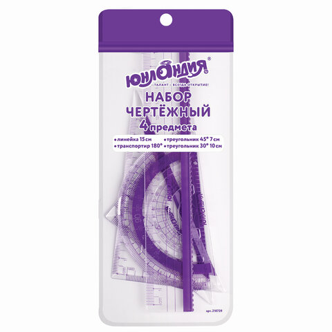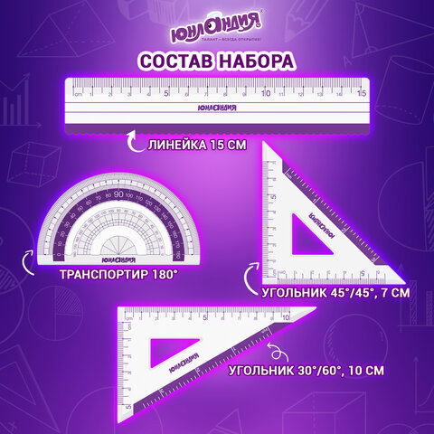Набор чертежный малый ЮНЛАНДИЯ "ГЕОМЕТРИЯ" (линейка 15 см, 2 треугольника, транспортир), фиолетовая шкала, 210739