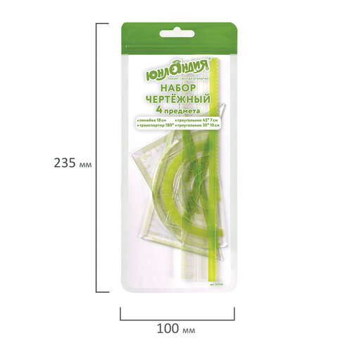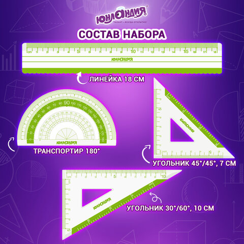 Набор чертежный ЮНЛАНДИЯ "ГЕОМЕТРИЯ" (линейка 18 см, 2 треугольника, транспортир), зеленая шкала, 210740
