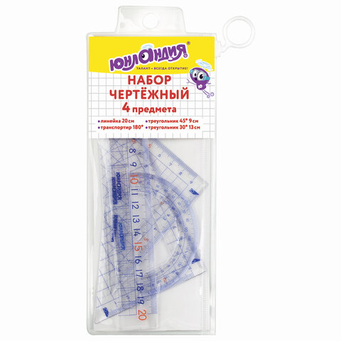 Набор чертежный ЮНЛАНДИЯ "ШКОЛЬНЫЙ" (линейка 20 см, 2 угольника, транспортир), пенал, 210737