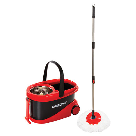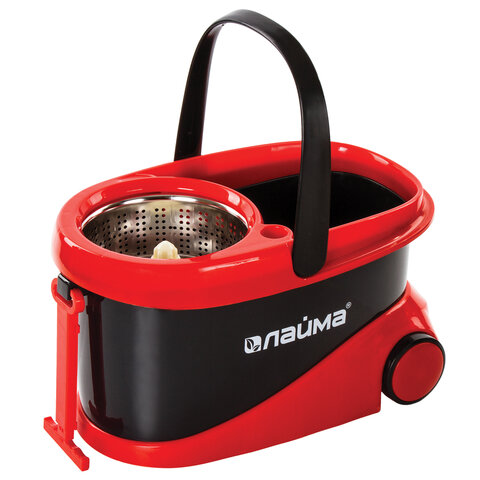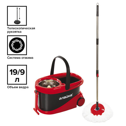 Швабра с отжимом и ведром 19л/9л на колесах и ручкой для перевозки, отжим центрифуга, 2 круглые насадки, черно-красный, LAIMA, 606303, M029B