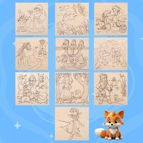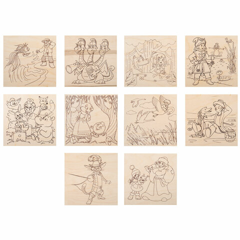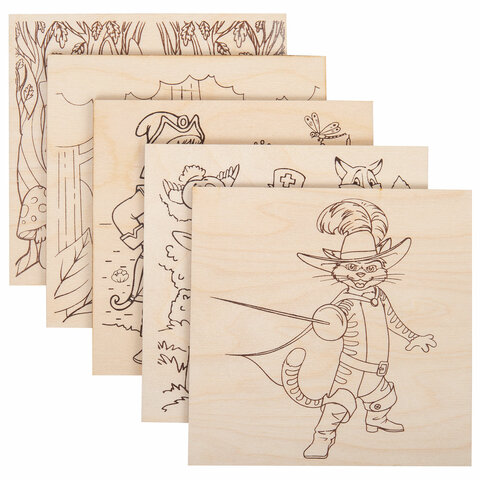 Заготовки деревянные для выжигания "Сказочные мотивы", 5 шт., 10 рисунков, 15х15 см, BRAUBERG HOBBY, 665306