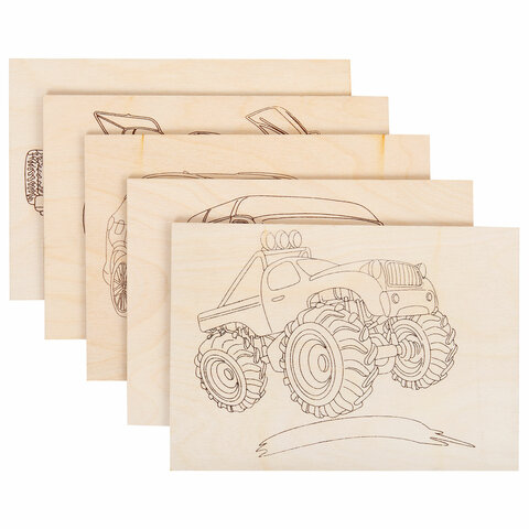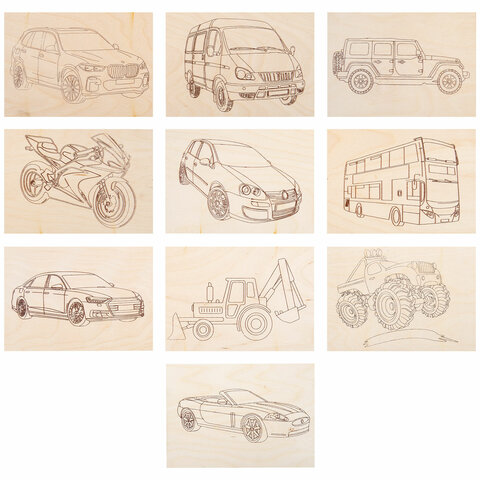 Заготовки деревянные для выжигания "Транспорт", 5 шт., 10 рисунков, 15х21 см, BRAUBERG HOBBY, 665307