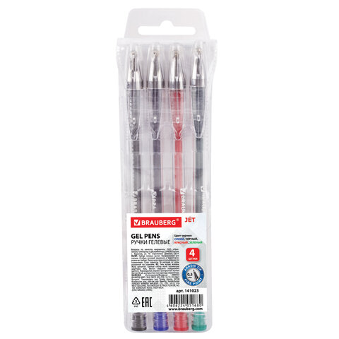 Ручки гелевые BRAUBERG "Jet", НАБОР 4 ЦВЕТА, узел 0,5 мм, линия письма 0,35 мм, 141023