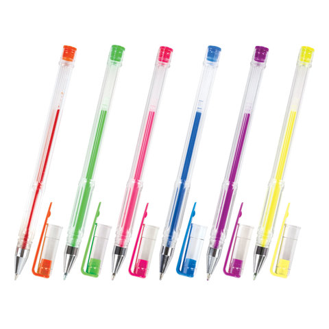 Ручки гелевые ПИФАГОР, НАБОР 6 ЦВЕТОВ, НЕОНОВЫЕ, корпус прозрачный, узел 0,7 мм, линия письма 0,5 мм, 142798