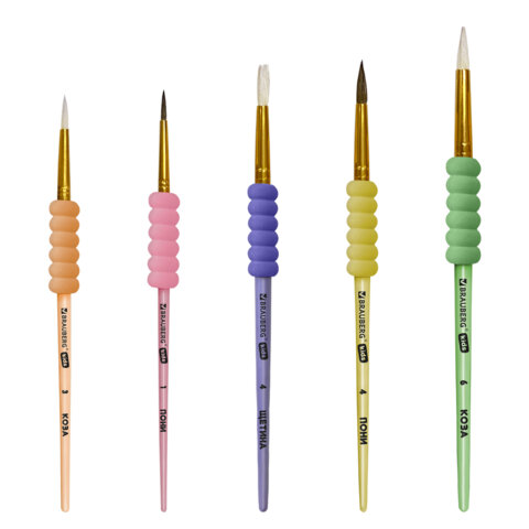 Набор из пяти кистей разного размера c мягкой EVA-вставкой BRAUBERG KIDS позволяет начинающим художникам решать любые творческие задачи в детском саду, школе и дома.