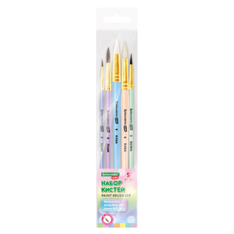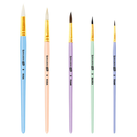 Кисти НАБОР 5 шт. (БЕЛКА круглая № 3; КОЗА круглые № 6, 8; ПОНИ круглые № 2, 5), BRAUBERG KIDS, 201080