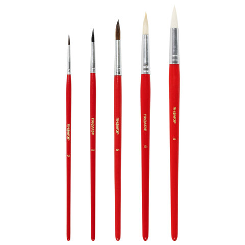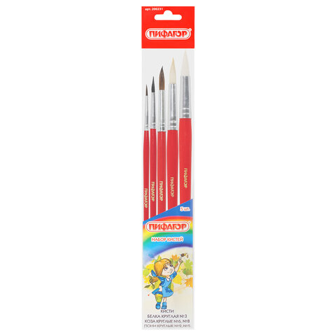 Кисти ПИФАГОР, набор 5 шт. (БЕЛКА: круглая № 3; КОЗА: круглые № 6, 8; ПОНИ: круглые № 2, 5), пакет с европодвесом, 200231