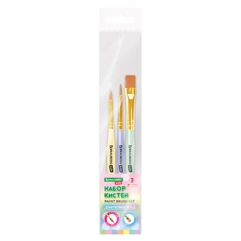 Кисти СИНТЕТИКА набор 3 шт. (круглые № 1, 2, плоская № 3), пакет с европодвесом, BRAUBERG KIDS, 201078