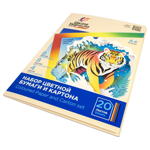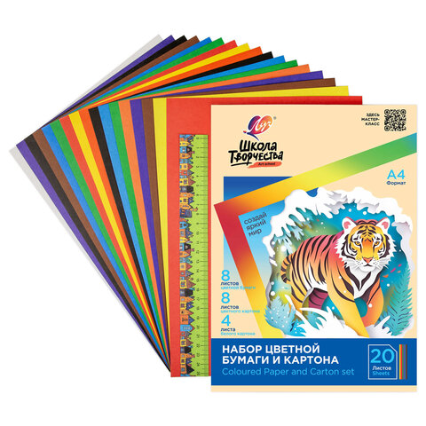 Набор картона и бумаги А4 немелованный (белый 4 л., цветной 8 л., офсет 8 л.), ЛУЧ "Школа творчества", 35С 2294-08
