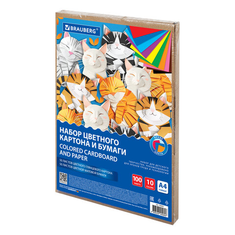 Набор цветного картона и бумаги А4 50+50 л., 10 цветов (картон мелованный + бумага офсетная) в коробке, BRAUBERG, 116421