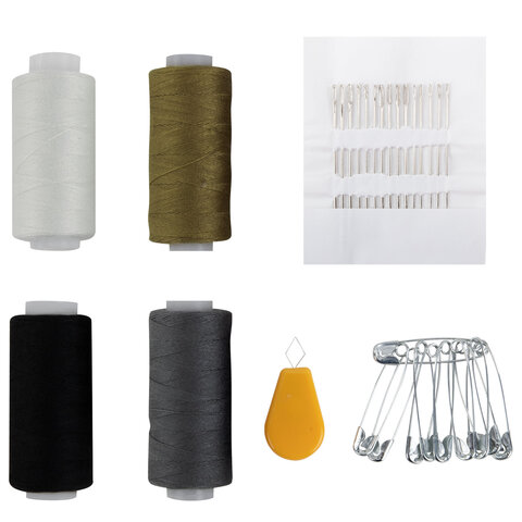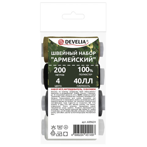 Набор швейный "Армейский", 40 ЛЛ, 200 м, 4 цвета, иглы, нитевдеватель, булавки, DEVELIA (Девелиа), 609631