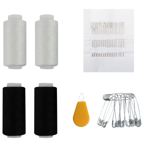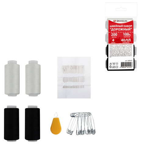 Набор швейный "Дорожный" 40 ЛЛ, 200 м, 2 белые / 2 черные, иглы, нитевдеватель, булавки, DEVELIA (Девелиа), 609632