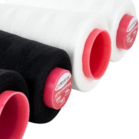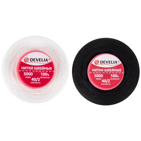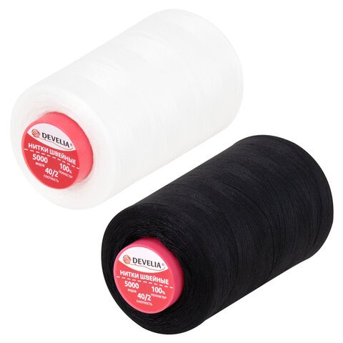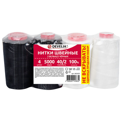 Нитки швейные 40/2 5000 ярд. (4572 м), Набор 2 белых/2 черных, DEVELIA (Девелиа), 665429