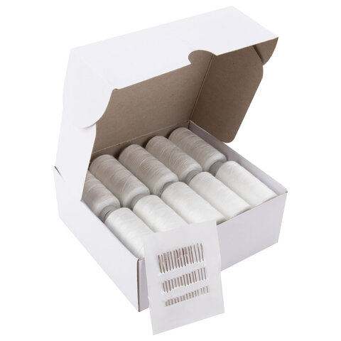 Нитки швейные 40 ЛШ, 200 м, полиэстер, НАБОР 20 шт., белые, в ПОДАРОК иглы, DEVELIA (Девелиа), 609621