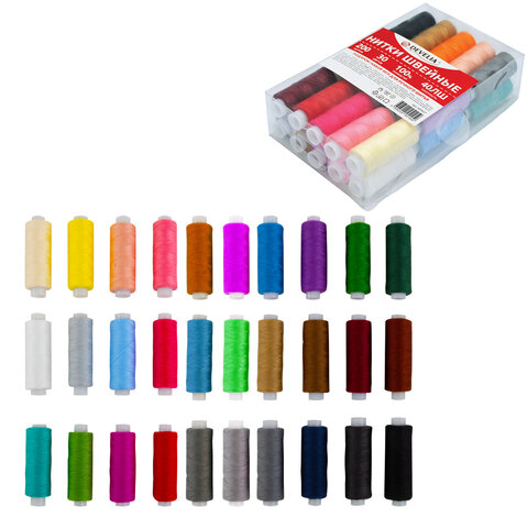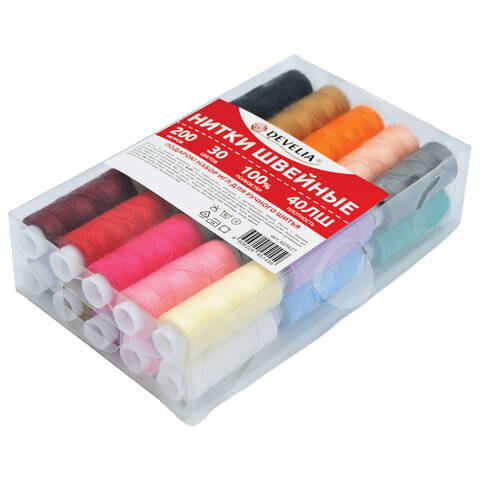 Нитки швейные 40 ЛШ, 200 м, полиэстер, НАБОР 30 цветов, в ПОДАРОК набор игл, DEVELIA (Девелиа), 609627