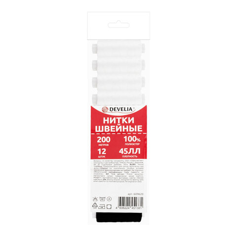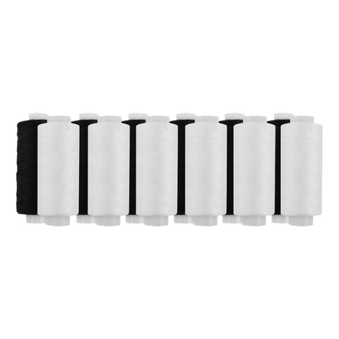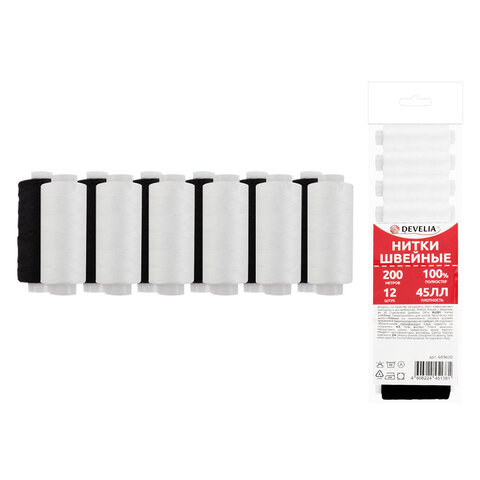 Нитки швейные 45 ЛЛ, 200 м, полиэстер, НАБОР 12 штук, 6 белых / 6 черных, DEVELIA (Девелиа), 609620