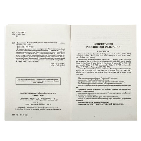 Брошюра "Конституция РФ" (с гимном России), НОВАЯ РЕДАКЦИЯ, мягкий переплёт, 127540
