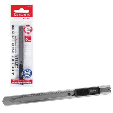 Нож канцелярский 9 мм BRAUBERG "Extra 30", металлический, лезвие 30°, автофиксатор, подвес, 237084