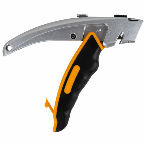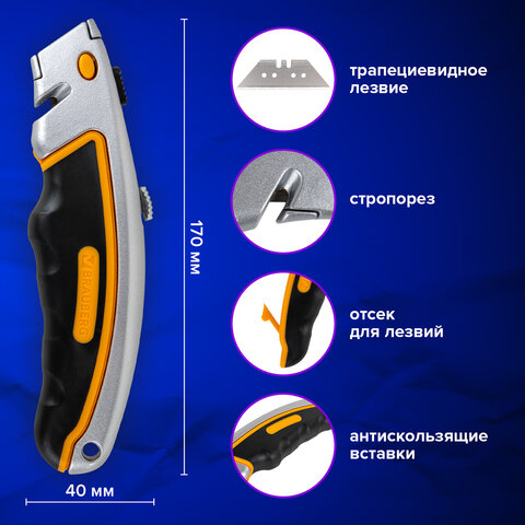 Универсальный мощный нож с автофикстором BRAUBERG "Heavy duty" – инструмент, который поможет при резке бумаги, пластика, картона и прочих плотных и вязких материалов: линолеума, гипсокартона, ковролина.