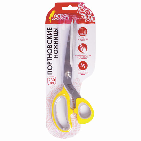 Ножницы портновские ОСТРОВ СОКРОВИЩ ПРЕМИУМ, 230 мм, желтые с резиновыми серыми вставками, 237455