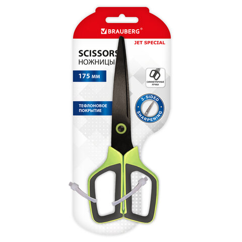 Ножницы BRAUBERG "JET Special", салатовые, 175 мм, 3-сторонняя заточка, тефлоновое покрытие, 238851