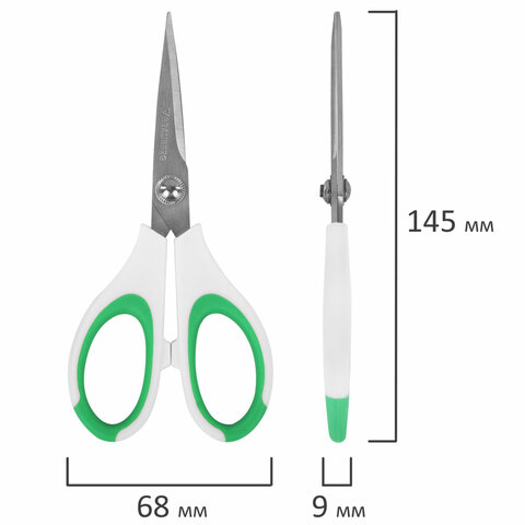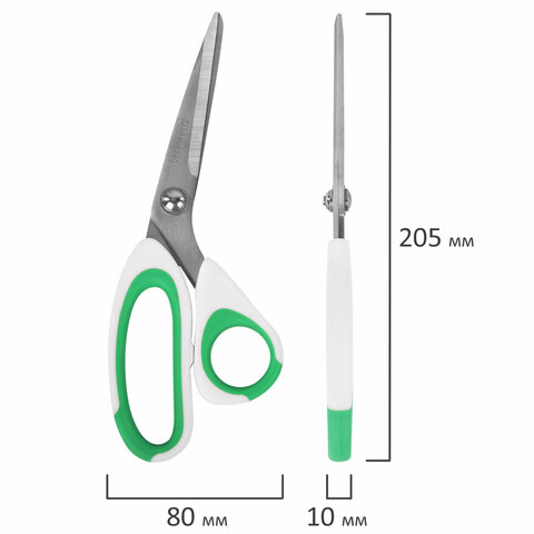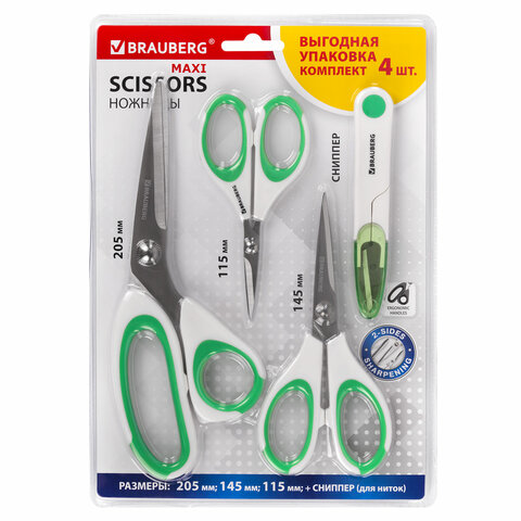 Ножницы BRAUBERG "MAXI" КОМПЛЕКТ 4 шт.: 115, 145, 205 мм + сниппер (для ниток), бело-зеленые ручки, 272982