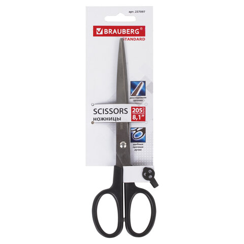 Ножницы BRAUBERG "Standard" 205 мм, черные, классической формы, 2-х сторонняя заточка, 237097