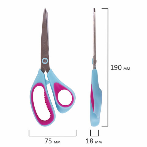 Ножницы BRAUBERG "Universal", 190 мм бирюзово-фиолетовые, ассиметричные, ребристые резиновые вставки, 236452