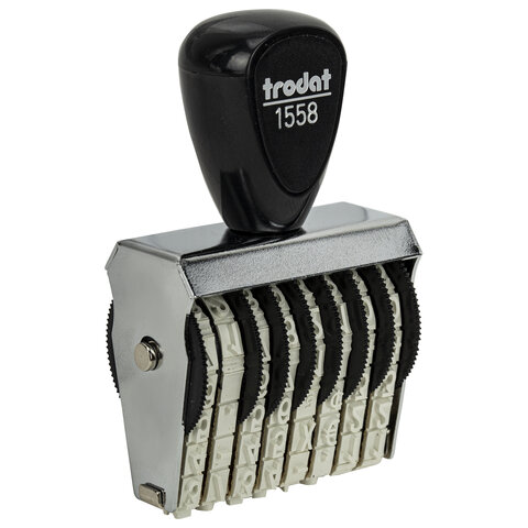 Надежный металлический корпус обеспечивает прочность конструкции. Ручки эргономичной формы делают TRODAT 1558 удобными в эксплуатации. Имеет специальные колёсики для выставления номера. Для использования необходима настольная штемпельная подушка.
