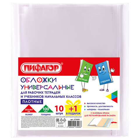 Обложки ПЭ для тетрадей и учебников с клейким краем, НАБОР "10+1 шт в ПОДАРОК", ПЛОТНЫЕ, 100 мкм, 265х467 мм, универсальные, ПИФАГОР, 272699