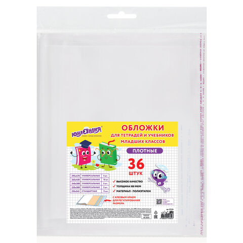 Обложки ПЭ для тетрадей и учебников младших классов, НАБОР 36шт, КЛЕЙКИЙ КРАЙ, 110 мкм, ПЛОТНЫЕ, универсальные, прозрачные, ЮНЛАНДИЯ, 274116