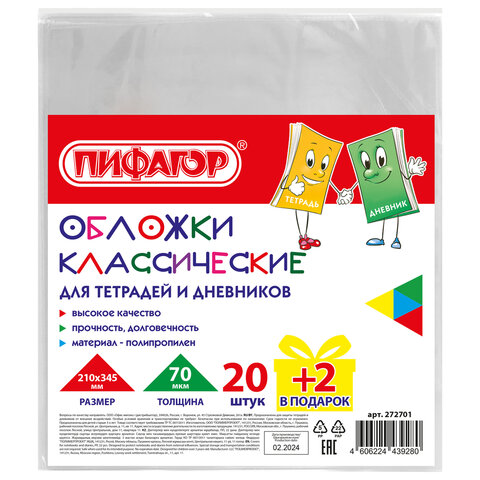 Обложки ПП для тетрадей и дневников, НАБОР "20 шт. + 2 шт. в ПОДАРОК", 70 мкм, 210х345 мм, прозрачные, ПИФАГОР, 272701