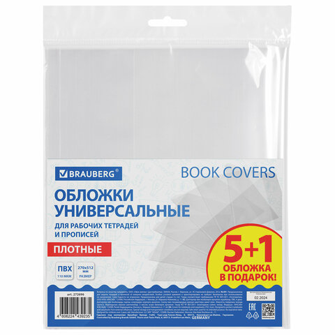 Обложки ПВХ для рабочих тетрадей и прописей, НАБОР "5 шт. + 1 шт. в ПОДАРОК", ПЛОТНЫЕ, 110 мкм, 270х512 мм, универсальные, BRAUBERG, 272696