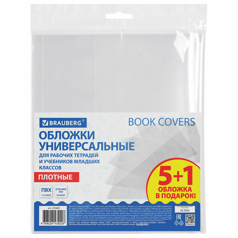 Обложки ПВХ для рабочих тетрадей и учебников младших классов, НАБОР "5 шт. + 1 в ПОДАРОК", ПЛОТНЫЕ, 110 мкм, 270x485 мм, BRAUBERG, 210695, 272695