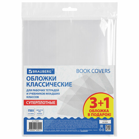 Обложки ПВХ для рабочих тетрадей и учебников, НАБОР "3 шт + 1 шт в ПОДАРОК", СУПЕРПЛОТНЫЕ, 250 мкм, 265x410 мм, прозрачные, BRAUBERG, 272694
