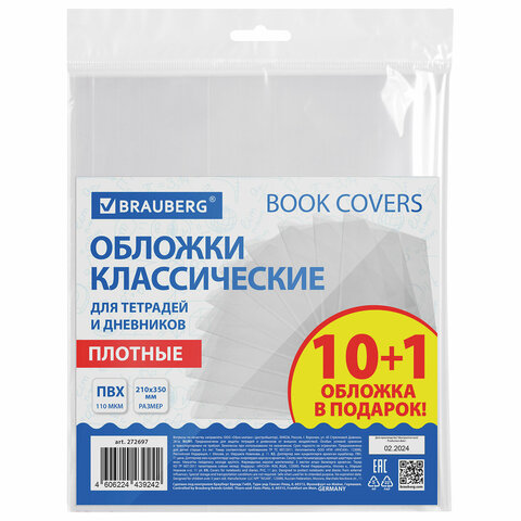 Обложки ПВХ для тетрадей и дневников, НАБОР "10 шт. + 1 шт. в ПОДАРОК", ПЛОТНЫЕ, 110 мкм, 210х350 мм, прозрачные, BRAUBERG, 272697