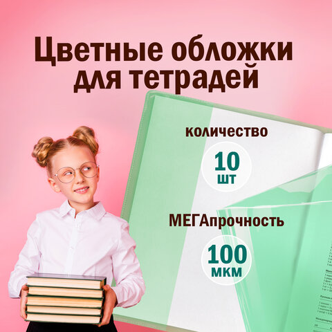 Обложки ПВХ для тетрадей и дневников, КОМПЛЕКТ 10 шт., ЦВЕТНЫЕ, ПЛОТНЫЕ, 100 мкм, 210х350 мм, ПИФАГОР, 227477