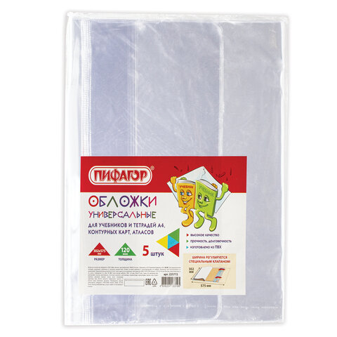 Обложки ПВХ для учебников и тетрадей А4, контурных карт, атласов БОЛЬШОГО ФОРМАТА, КОМПЛЕКТ 5шт, ПЛОТНЫЕ, 120мкм, 302х575мм, ПИФАГОР, 225772