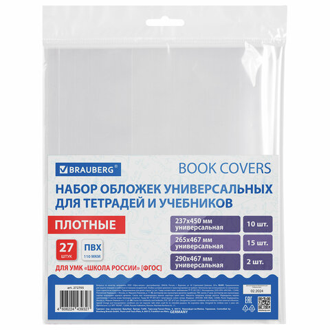 Обложки ПВХ для учебников и тетрадей, НАБОР 27 шт., ПЛОТНЫЕ, 110 мкм, универсальные, прозрачные, BRAUBERG, 272705