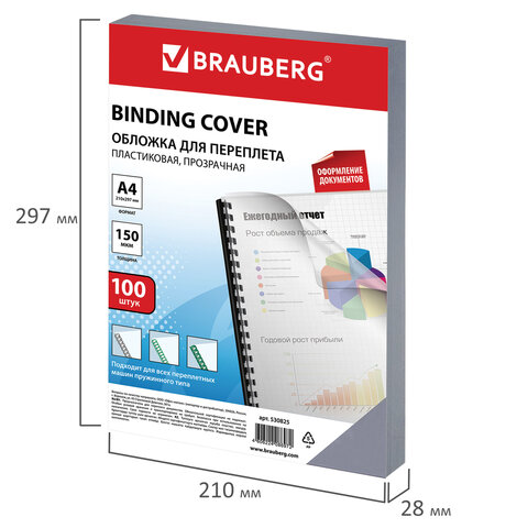 Обложки пластиковые для переплета, А4, КОМПЛЕКТ 100 шт., 150 мкм, прозрачные, BRAUBERG, 530825