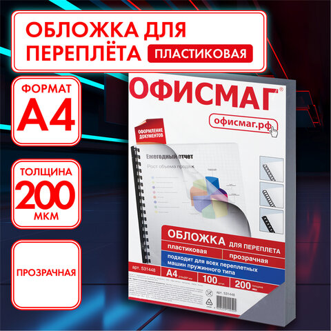 Обложки пластиковые для переплета, А4, КОМПЛЕКТ 100 шт., 200 мкм, прозрачные, ОФИСМАГ, 531448