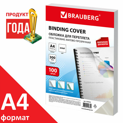 Обложки пластиковые для переплета, А4, КОМПЛЕКТ 100 шт., 300 мкм, белые, BRAUBERG, 530939