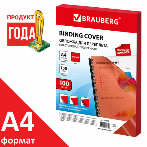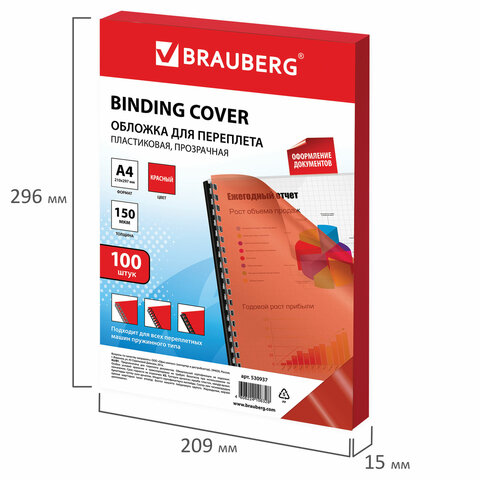 Обложки пластиковые для переплета А4, КОМПЛЕКТ 100 штук, 150 мкм, прозрачно-красные, BRAUBERG, 530937